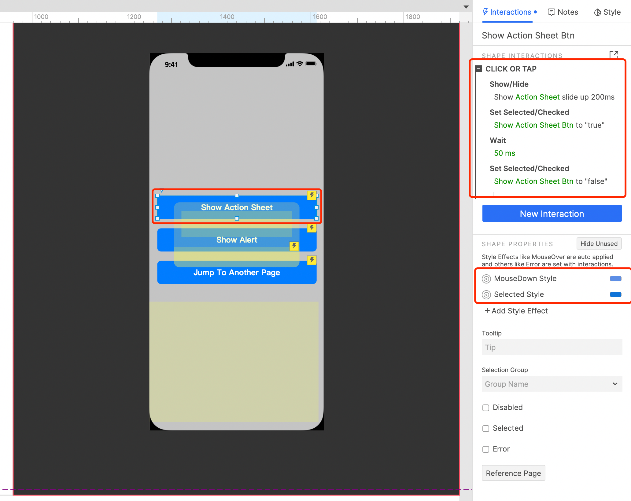 Then we set the interaction of each element, and set the selected style of the clicked buttons, which is used to make its click effect. Because we will use the Trigger action later, it cannot directly act on the interaction style of the button, so the selected style is used instead.