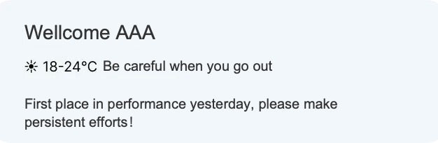For example: welcome with the name of the registrant. In addition, the display of weather and temperature reminds users that it may rain during off-duty hours, and the ultraviolet rays are strong today, so pay attention to sun protection when going out to visit customers.