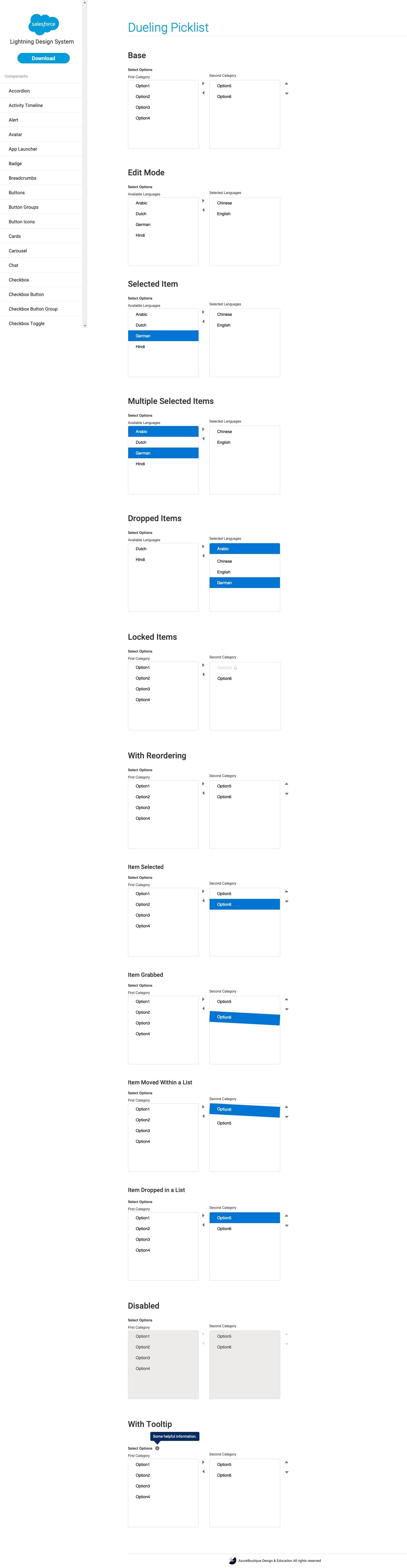 Accordion, Activity Timeline, Alert, Avatar, Badge, Breadcrumbs, Buttons, Button Groups, Button Icons, Cards, Carousel, Chat, Checkbox, Checkbox Button, Checkbox Button Group, Checkbox Toggle, Color Picker, Combobox, Counter, Data Table, Datetime Picker, Docked Composer, Datetime Picker, Datepickers, Docked Composer, Docked Form Footer, Docked Utility Bar, Drop Zone, Dueling Picklist, Illustration, Expandable Section, Expression, Feeds, File Selector, Files, Form Element, Global Header, Global Navigation, Input, List Builder, Lookups, Map, Menus, Modals, Notification, Page Headers, Panel, Path, Picklist, Pills, Popover, Progress Bar, Progress Indicator, Progress Ring, Prompt, Publishers, Radio Button Group, Radio Group, Rich Text Editor, Scoped Notifications, Scoped Tabs, Select, Setup Assistant, Slider, Spinners, Summary Detail, Base, Textarea, Tiles, Timepicker, Toast, Tooltips, Tree Grid, Trees, Trial Bar, Vertical Navigation, Vertical Tabs, Visual Picker, Welcome Mat